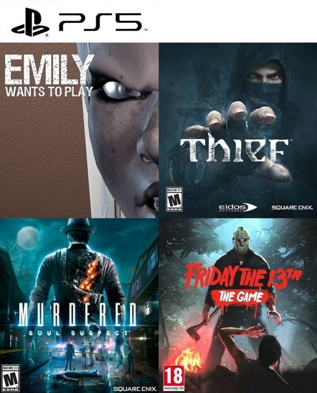 4 juegos en 1 Emily Wants To Play mas Thief mas Murdered: Soul Suspect mas Friday the 13th: The Game PS5